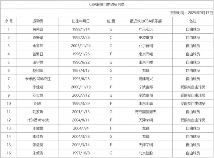 9月17日讯 今天,CBA官方更新了自由球员名单,黄荣奇在列。